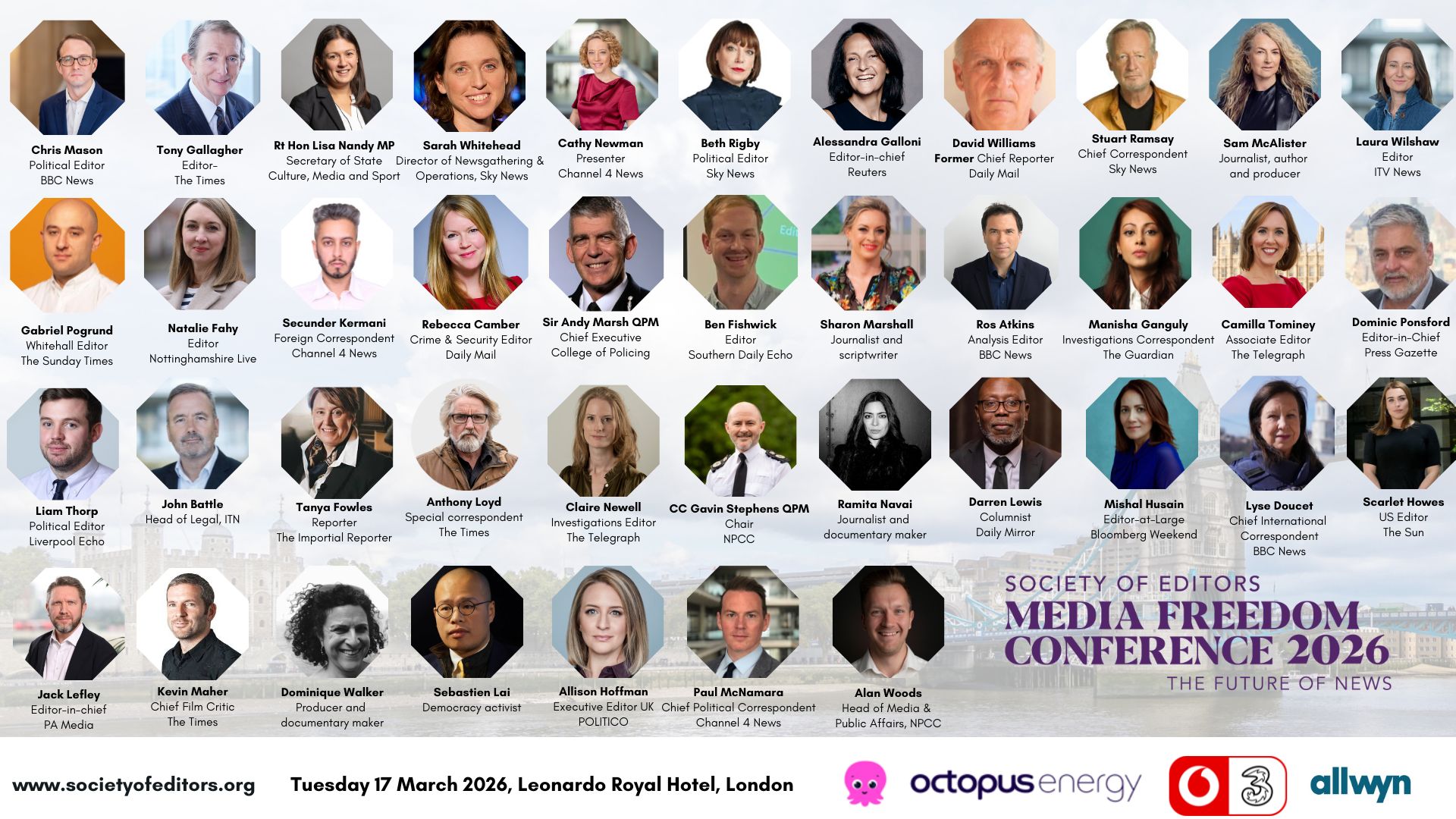The event, which took place at the Leonardo Royal Hotel in London, brought together more than 200 editors and news executives from across the UK’s national, regional, broadcast and digital media for a full day of debate, discussion and practical insight on the biggest challenges and opportunities facing journalism. The conference was supported by Allwyn, Octopus Energy and VodafoneThree.