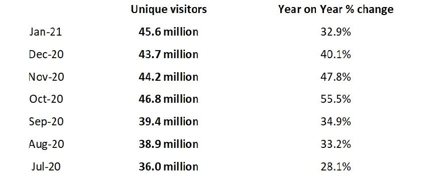 In the six months July to December 2020, Newsquest sites averaged monthly unique visitors of 41.5 million unique visitors, up 40.1% year on year.
